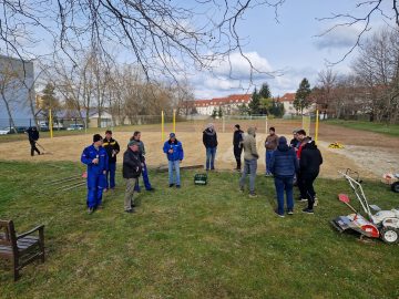Beim zweiten Arbeitseinsatz waren vorallem Herren I und die Beacher in Aktion. Hier wurden die Erdarbeiten mittels Motorhacke, Schaufel, Spaten und Harke erledigt, die Netzanlage gestellt, sowie das Fangnetz montiert.